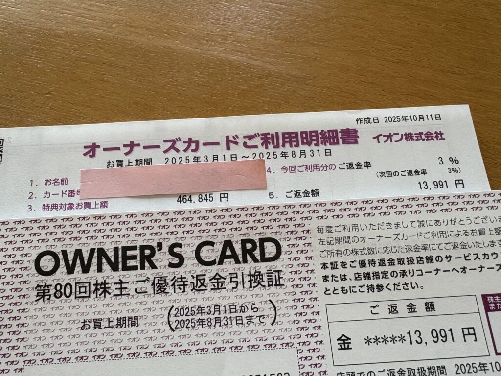 イオンの株主優待「オーナーズカード」を利用すると、半年に一度イオンで買い物した金額の3%がキャッシュバックされます(3%は300株保有の場合)。