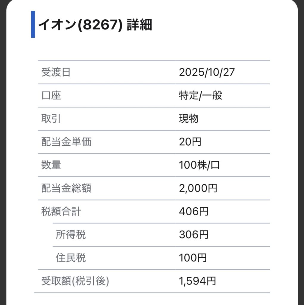 - 2025年10月の配当金2000円→税引後1594円